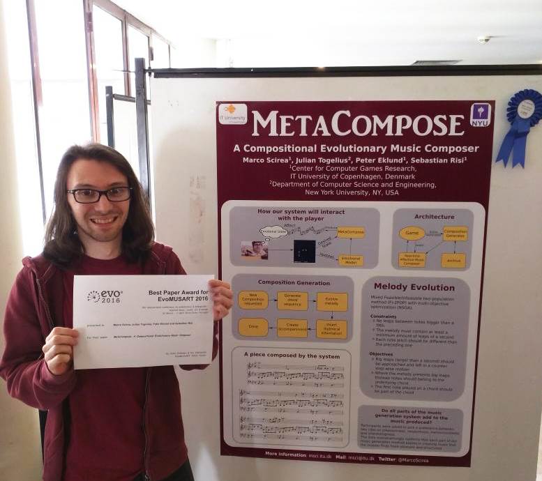 Marco Scirea vandt best paper-prisen ved EvoMUSART-konferencen i Porto.Den opdagelse kan vise sig at være en god nyhed for både spiludviklere og gamere. I sit ph.d.-projekt er Marco Scirea i gang med at udvikle musikgeneratoren MetaCompose til brug i computerspil.