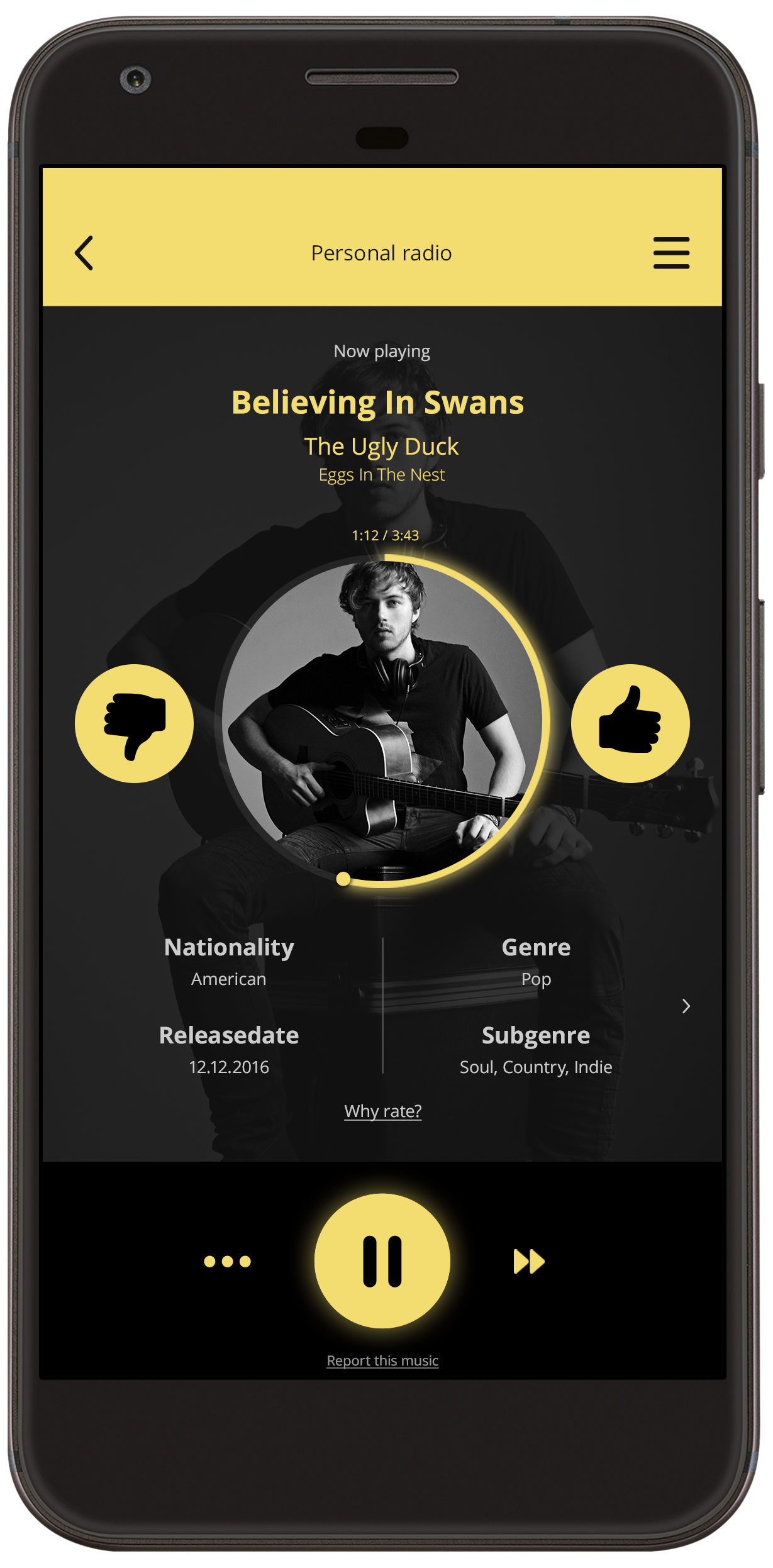 På appen kan brugerne definere hvilke musikgenrer, de kan lide, og bedømme numrene med tommel op eller ned. På den måde tilpasser den bagvedliggende algoritme musikstrømmen til den enkeltes smag, mens kunstnerne kan være sikre på at blive eksponeret for lyttere, som kan lide netop deres genre.